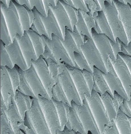 You see that neat little space between the head and the bottom fin? That's where all of the fish's organs are kept. Notably, they've got no ribs! What is keeping this massive burger from being eaten? It's their disgusting skin. They don't have scales like most fish. Instead they have rectangular "dermal denticles", or skin teeth. Seriously, the same idea as your teeth. They've got blood vessels and nerves, even an enamel. All sharks have these too. They reduce drag and offer protection.