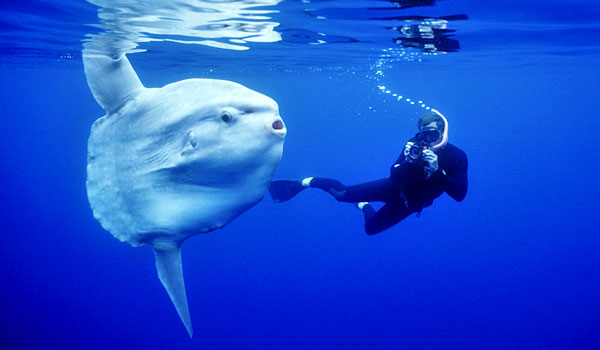 Alright, yeah it looks pretty weird. They get to be about 4 meters long and 4 meters tall. The largest mola caught was a Mola alexandrini weighing in at 6,050lbs. They are the largest bony fish, despite and because of their mostly cartilaginous skeleton. Cartilage is lighter than bone, making it easier and less expensive to move around. It's great that they have that going for them because nothing else about this fish screams "mobile." They have a shortened, fused spine. They have no muscles on the sides of their bodies to swish their tail back and forth like other fish. They have a tail, but it never develops. They have no swim bladder to control their bouyancy. Just two, highly-muscularized fins at the top and bottom. You wouldn't be wrong to call it a head with wings.